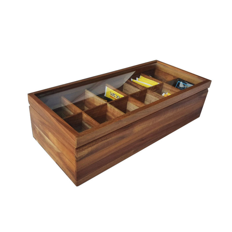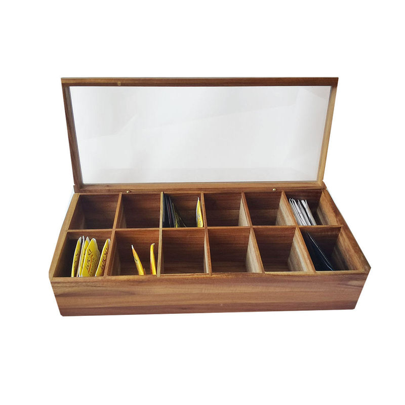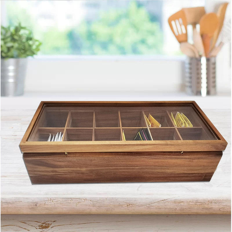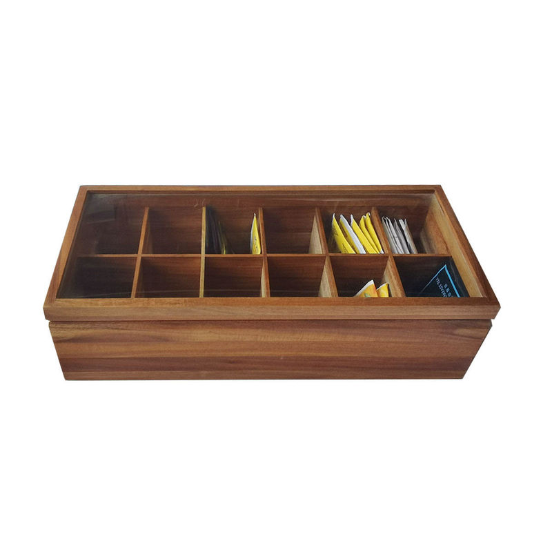Ayarlanabilir Düz Sandık 12 Bölmeli Ahşap Çay Poşeti Saklama Kutusu Cam Üstü